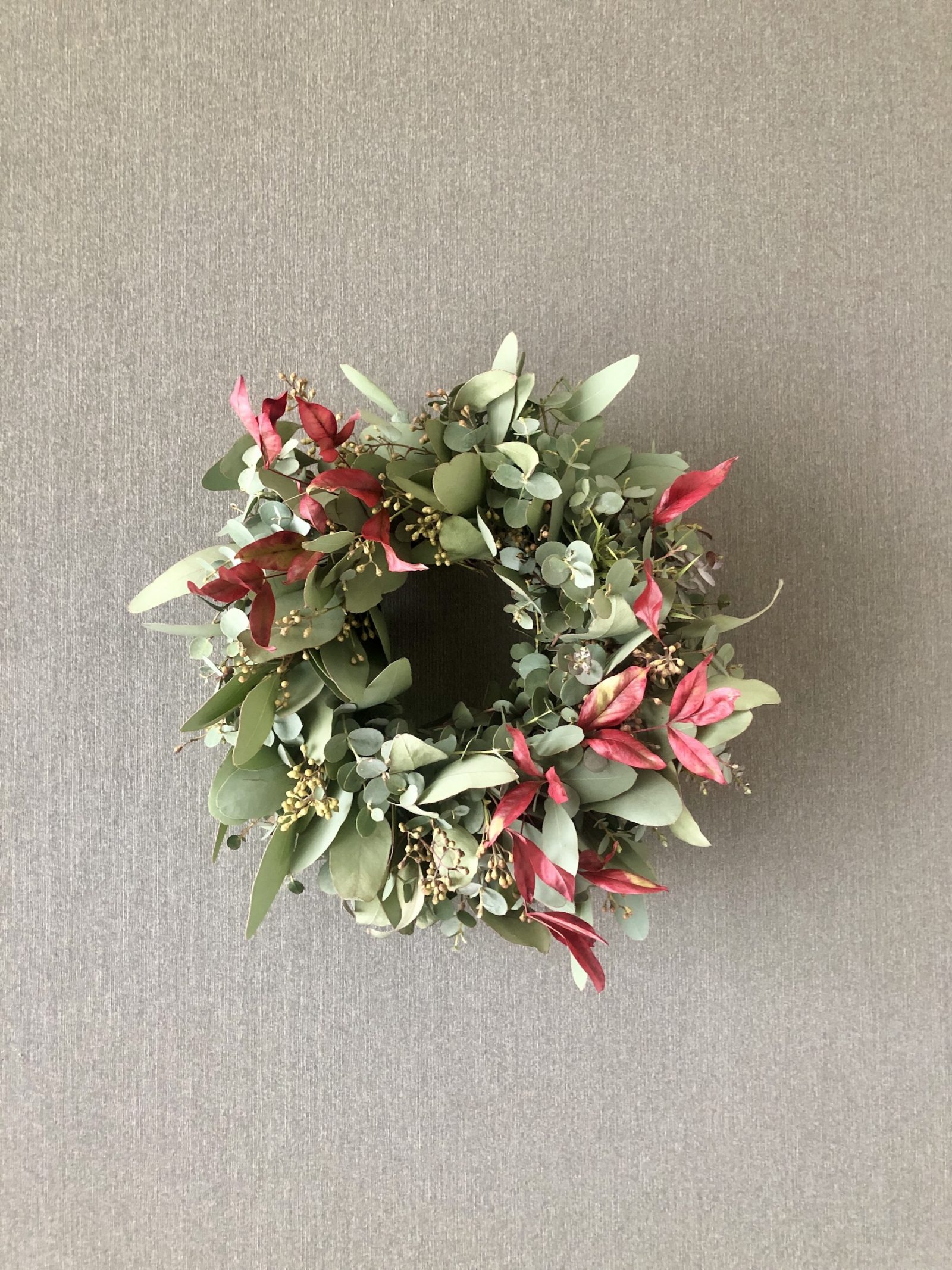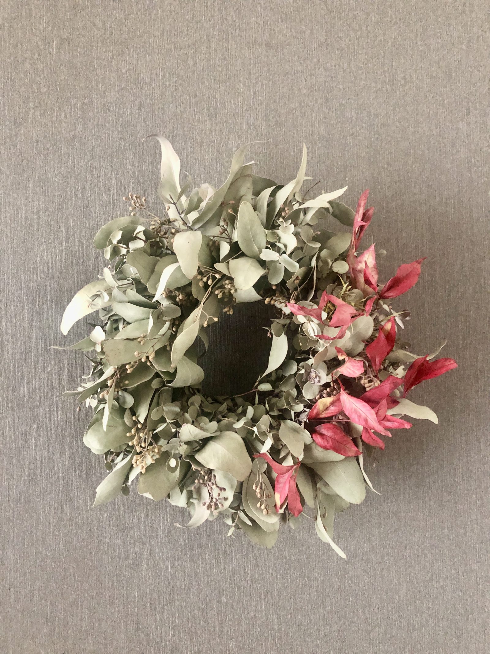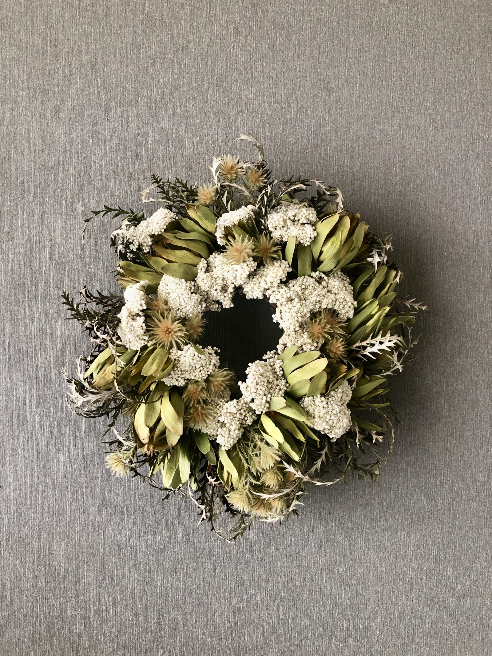 生花の状態でリースを製作して、その後ドライへゆっくりと移り変わっていく様子を楽しんでいただきたいなあという思いから、レッスンを始めました。