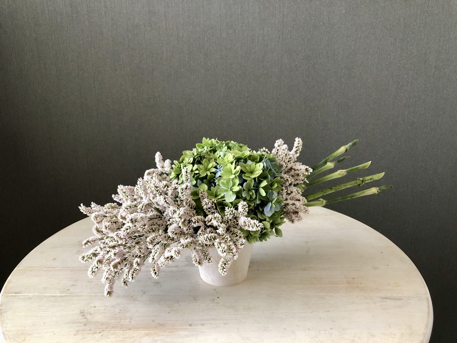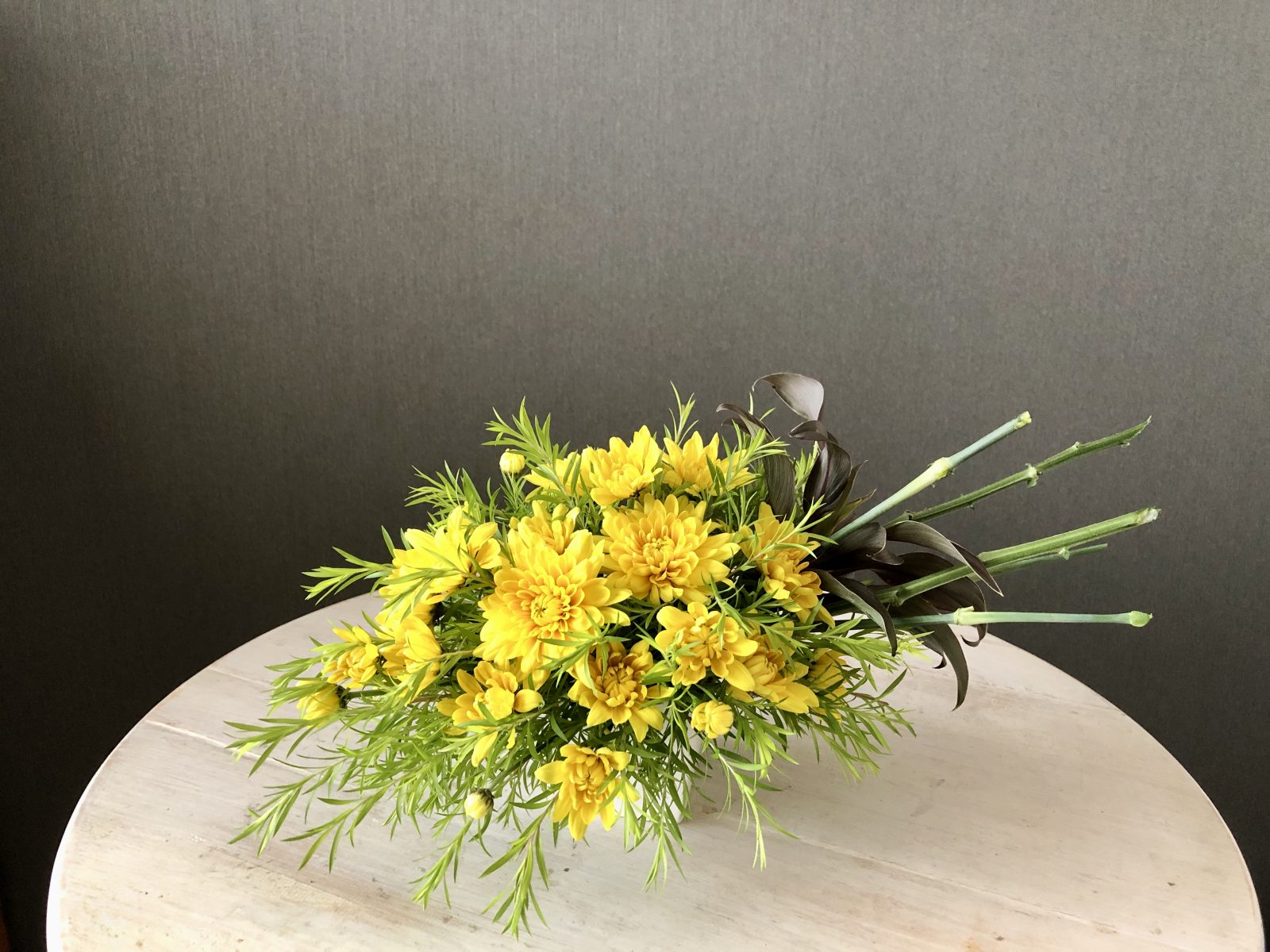 花束をテーブルに置いたようなアレンジメント。